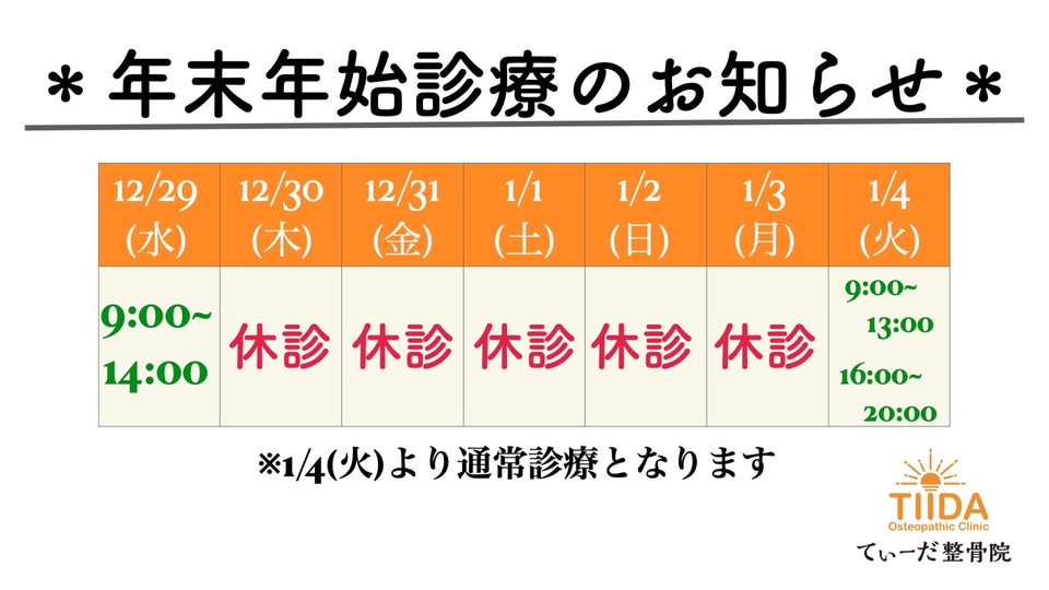 年末年始の診療は以下の通りとなりますので、よろしくお願いいたします。